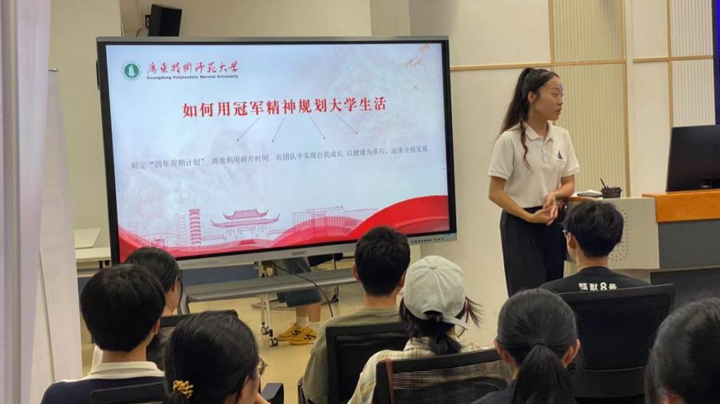 第九期主题活动聚焦大运会冠军背后的成功密码,为同学们带来一场充满力量的精神洗礼。作为冠军教练,杨帆老师以饱满的激情,结合自身丰富经验,深度揭秘多项赛事背后的心法奥秘。她着重强调突破自我极限的勇气与坚持到底的毅力,鼓励同学们摒弃“遇小事可行,遇大事则倒”的不良习惯,不断挑战自我、超越自我,向着成功奋勇前行。活动现场,超燃的“汗水的价值”主题互动沙龙引发热烈讨论,同学们在交流中深刻领悟每一份努力的意义。杨老师用坚定的话语传递信念——内心强大方能无所畏惧,为同学们注入拼搏奋进的强劲动力。