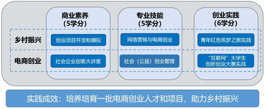 微专业注重学生综合理论素养、实践能力和创新创业能力的培养,构建服务乡村振兴和电商创业的全面知识体系,打破固有的学科边界、专业壁垒,将课堂延伸至各个实际场景。学生通过学习,将有机会完善个人社会价值主张;分析行业和市场;对客户和竞争对手进行首要研究;建立社会价值主张;评估分销渠道、定价策略和各类业务模型;估算风险投资的资源需求;练习向社会企业家和投资者介绍自己的商业计划。最后,引导学生参与乡村振兴、电商创业助农等实践活动,在创新创业中发挥聪明才干,将个人成长与党和国家的发展紧密结合起来。