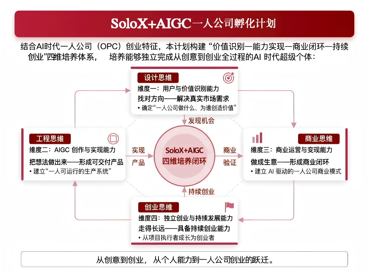 结合AI时代一人公司(OPC)创业特征,本计划构建“价值识别—能力实现—商业闭环—持续创业”四维培养体系,培养能够独立完成从创意到创业全过程的AI 时代超级个体: